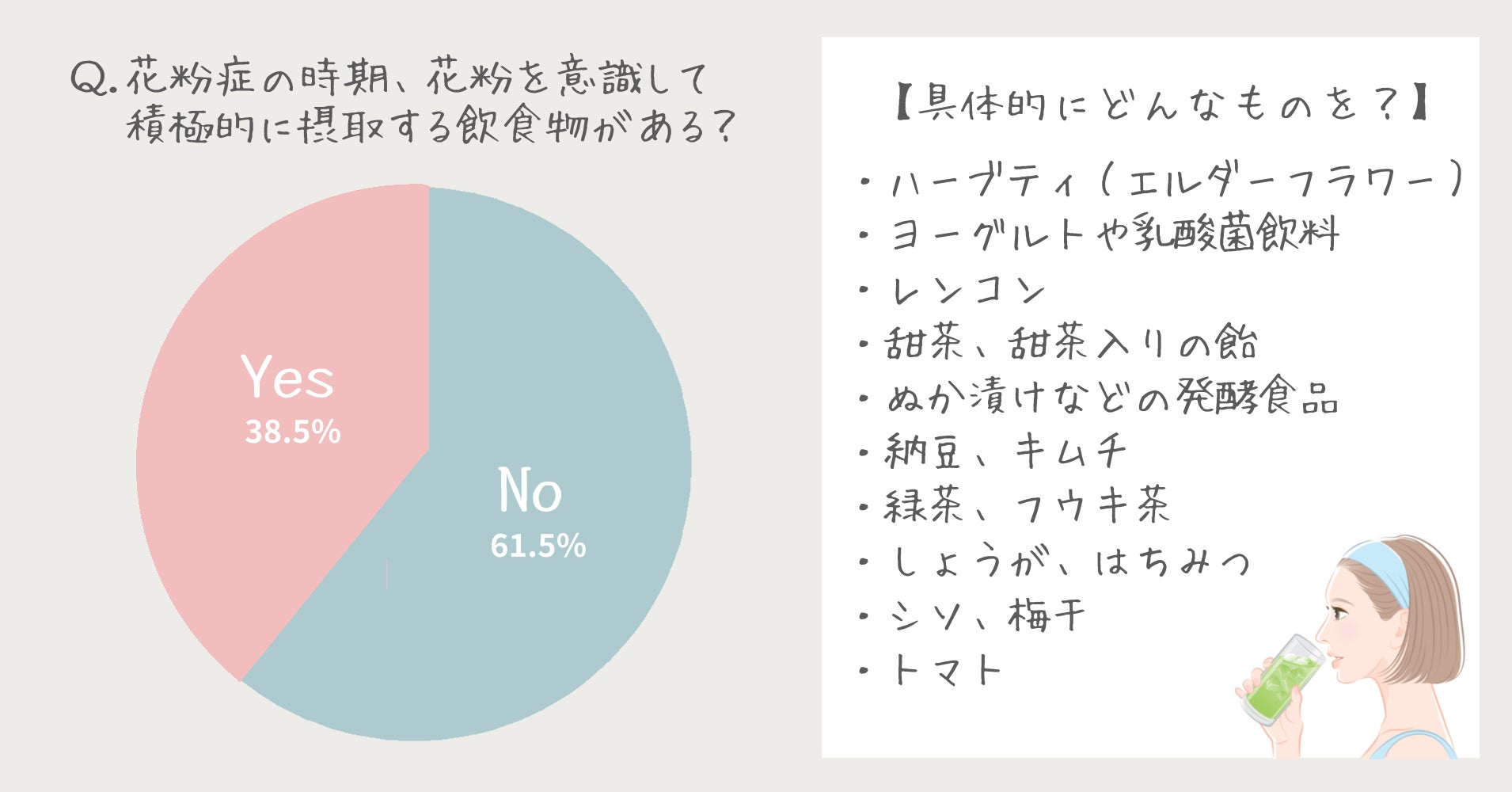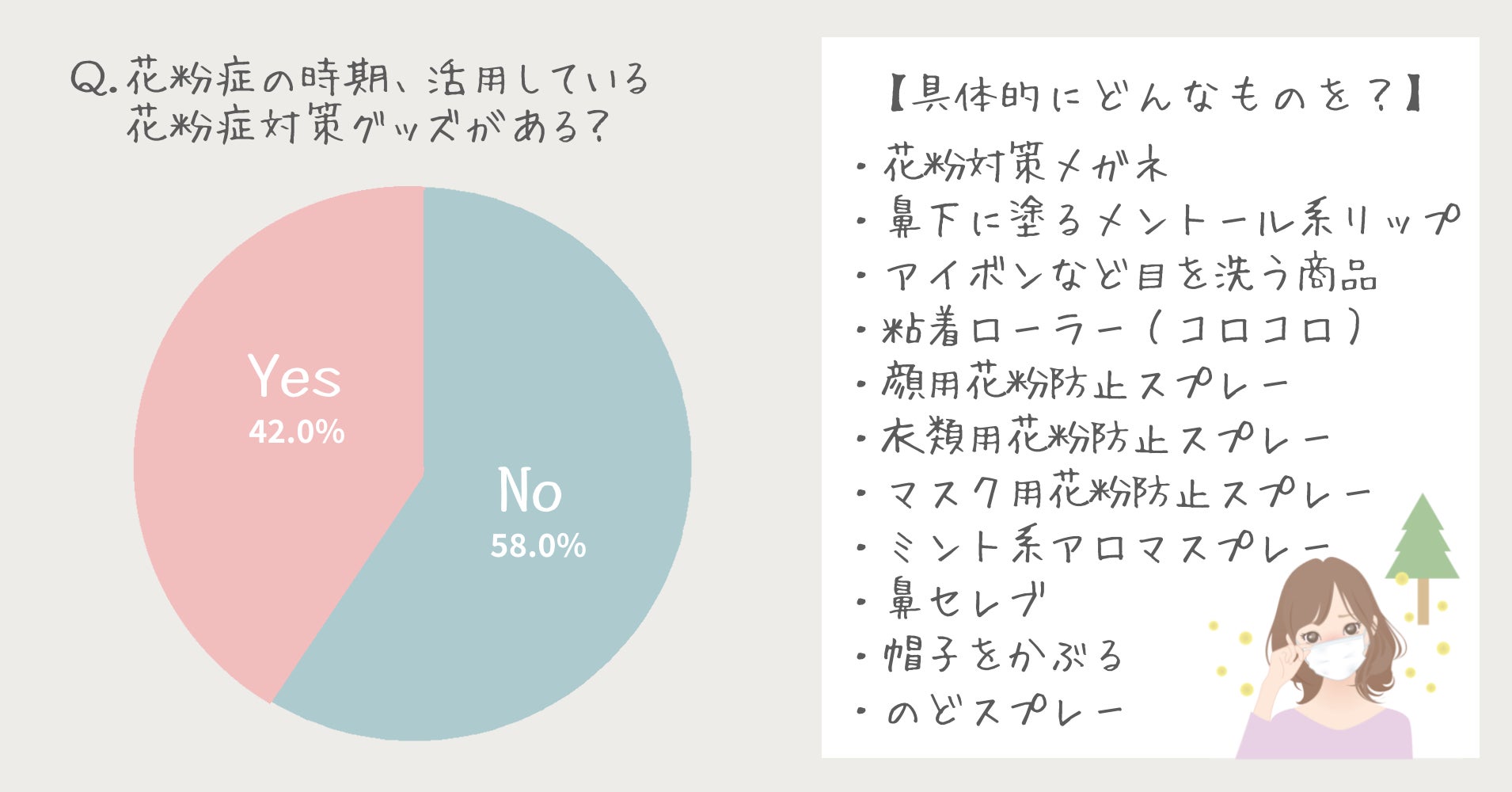 なるべく症状に苦しまなくて良いように日頃から心掛けている花粉症対策もさまざまで、下記のように機能性グッズで花粉をシャットアウトしたり、食べもので体の免疫力を高めて症状を出にくくする、そんな対策をしている女性も多くいました。