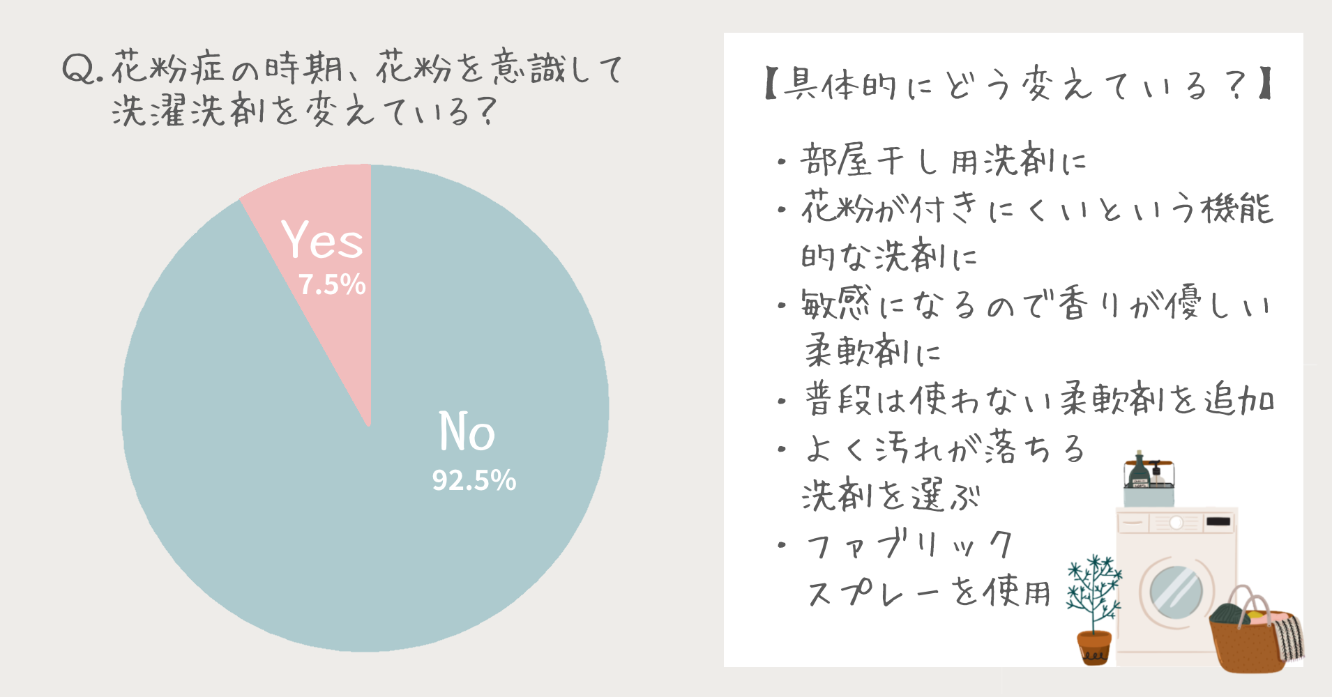 一方、衣類に付着する花粉も気になるもの。この時期、花粉症対策のために洗濯洗剤をいつもと違うものに変えるという女性は7.5%。