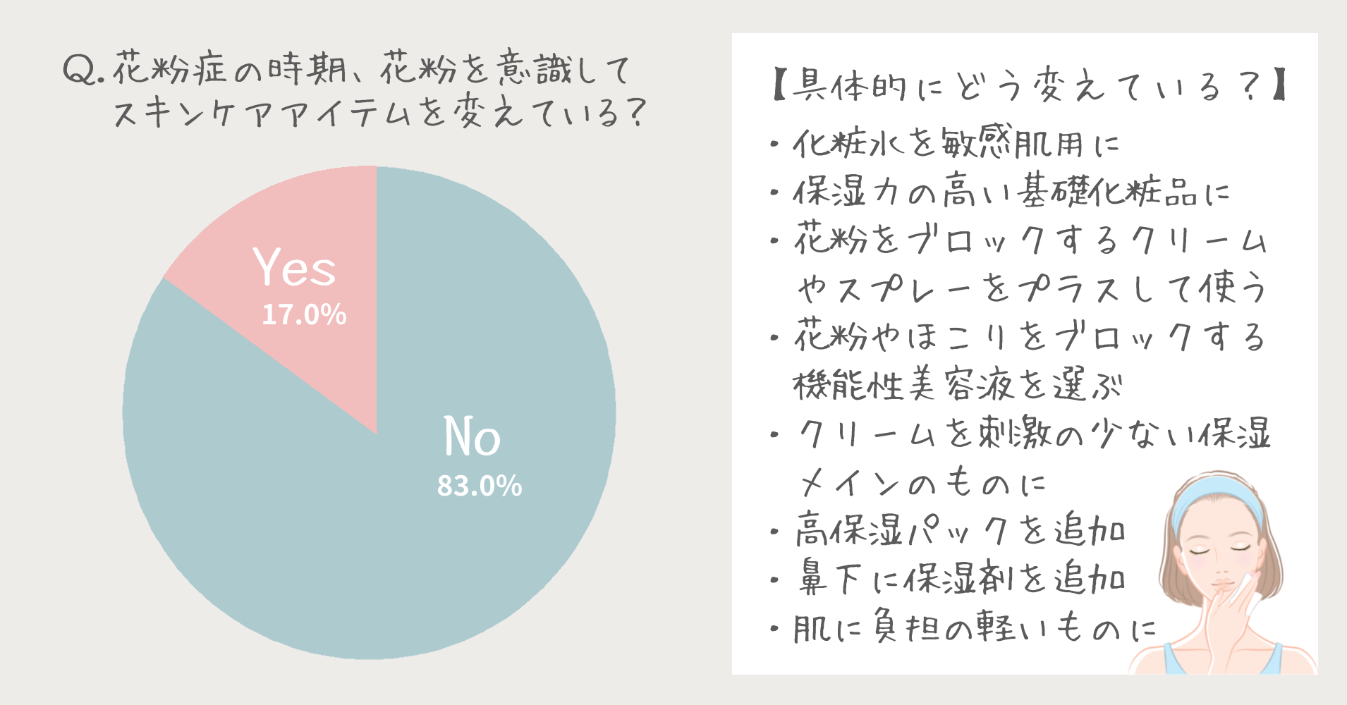 実際、花粉症のこの時期は肌のコンディションからスキンケアアイテムをいつもと違うものに変えているという女性は17.0%。