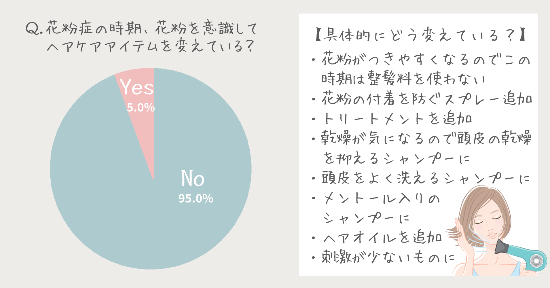 シャンプー&コンディショナーやスタイリング剤をいつもと違うものに変えているという女性は5%と少なめですが、アンケートでは「髪に付着した花粉症が気になる」という方は76.0%にものぼり、少なからず髪や頭皮に花粉の影響を感じているようです。
