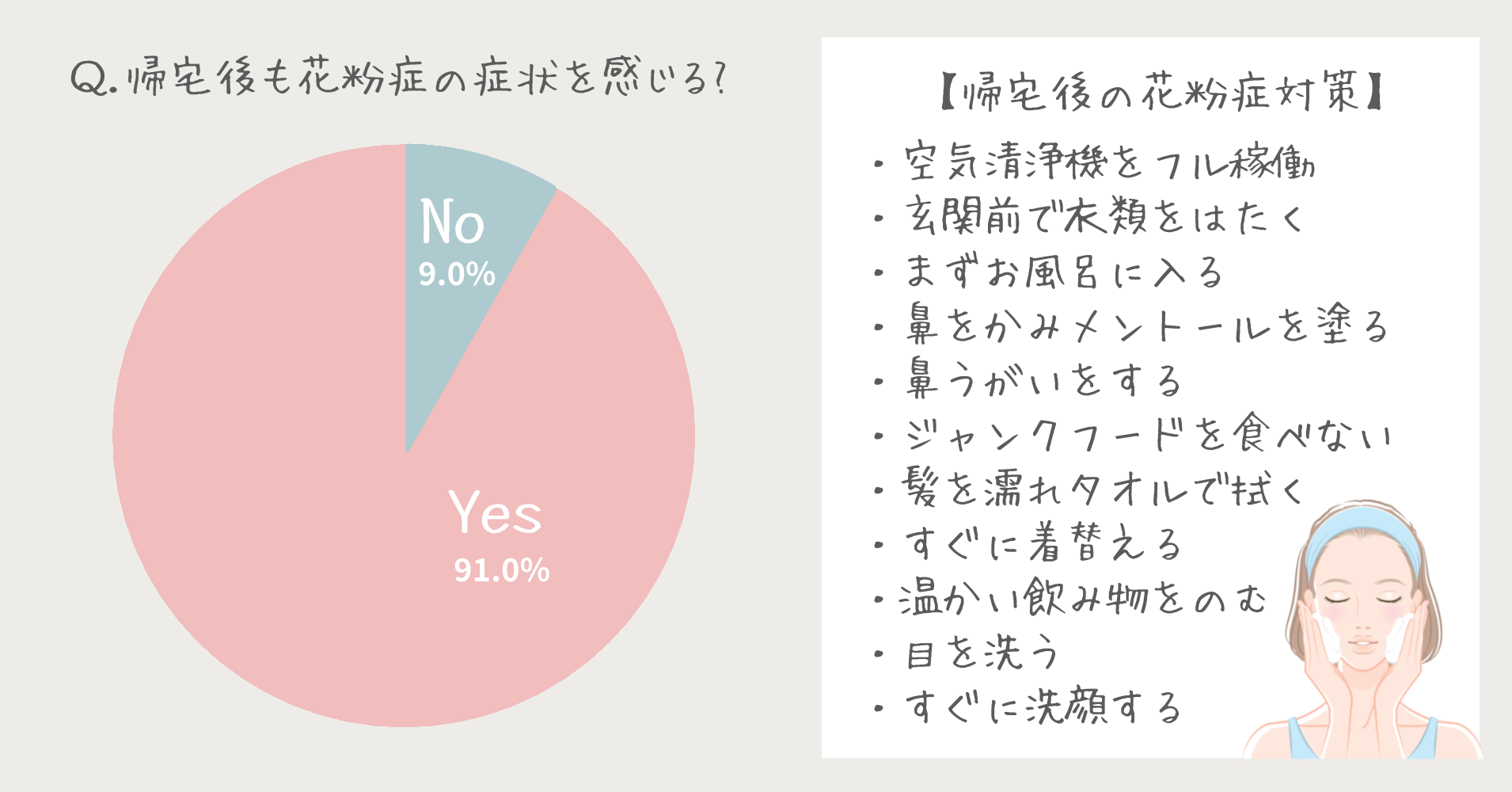 - 家に帰っても花粉症の症状を感じる女性は9割超