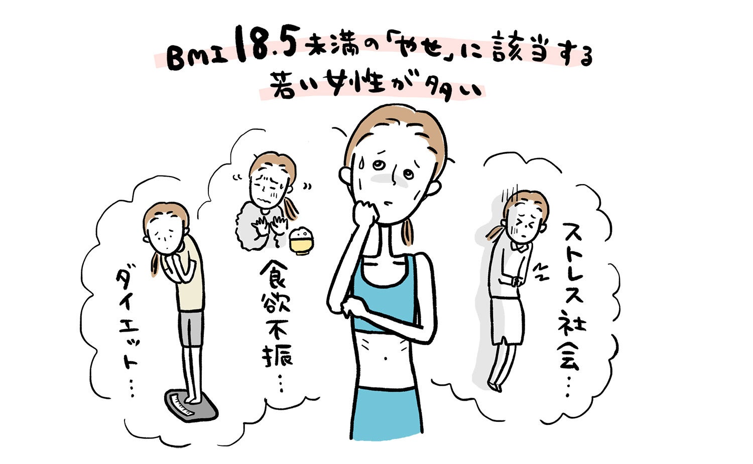 近年、BMI 18.5未満の「やせ」に該当する若い女性は非常に多く、20代では全体の20〜25%前後で推移しています。この高い割合は、「やせている女性が美しい」との思い込みによるやせ願望が根強く、ダイエットを行うことが大きく影響しているほか、ストレスなどが原因で心身の不調により「太りたくても太れない」と訴える女性も増えています。