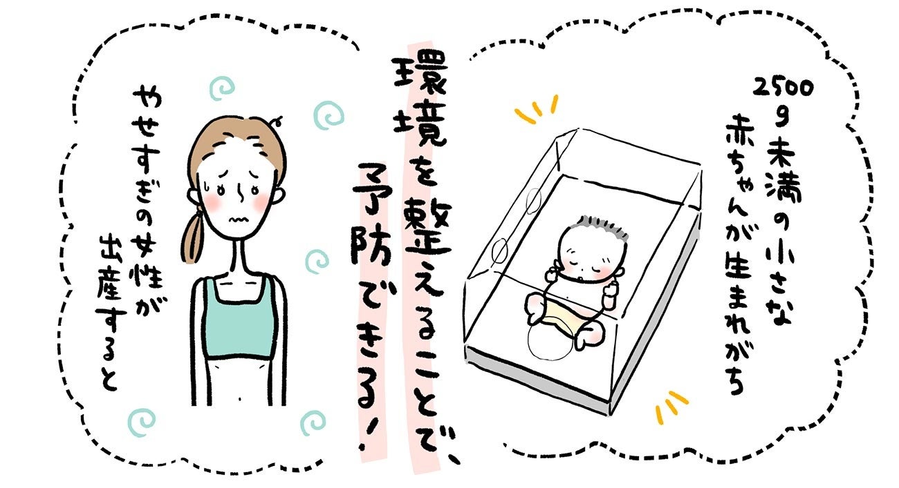 おなかの中にいる赤ちゃんは、そのママの栄養で育ちます。だからこそ、妊娠を希望する女性はしっかり栄養をとって健康でいることが大切ですが、近年は若い女性の「やせ」が深刻になり、やせた女性が妊娠、出産すると生まれてくる赤ちゃんにもリスクがある、と言われるようになりました。