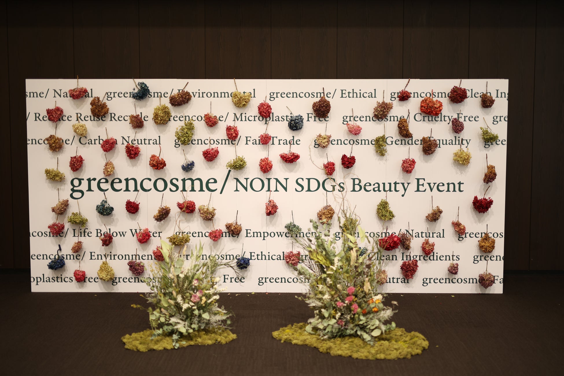 また今回フォトブースで使用した花は、株式会社RIN様のロスフラワー。式場などで使用されて、まだまだ美しいうちに廃棄されてしまう花を、ドライフラワーにして、デコレーション。メインで使用した赤いアジサイはサステナブルを楽しむ一人ひとりのハートを表現しています。