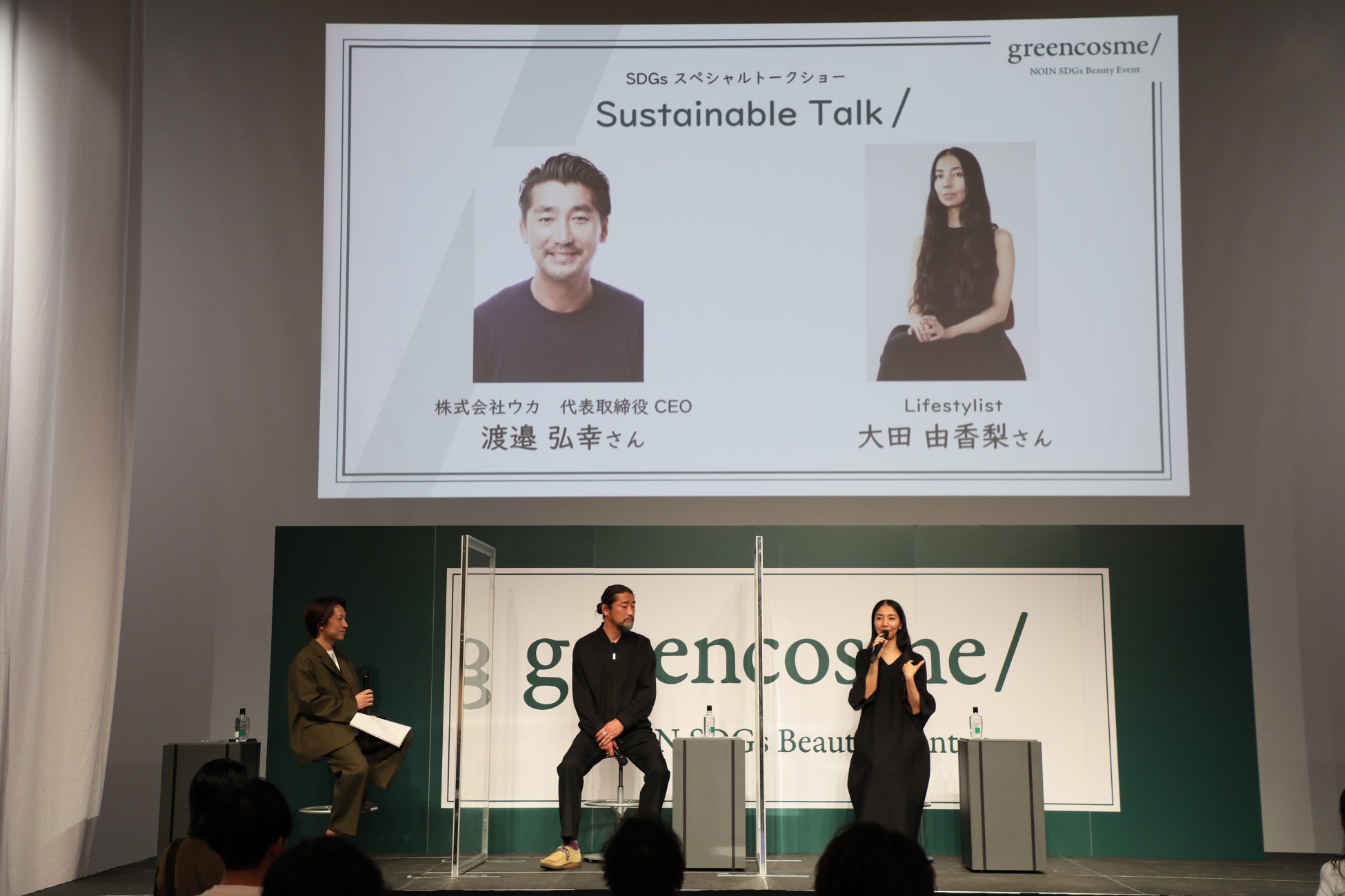 第二部では、uka の代表取締役CEO渡邉弘幸さん、ライフスタイリストの大田由香梨さんをお招きしました。ukaがどのようなサステナブルな取り組みを展開されているか、作る立場や発信する立場等において何を気を付けているか、Z世代に期待していること、等話して頂きました。