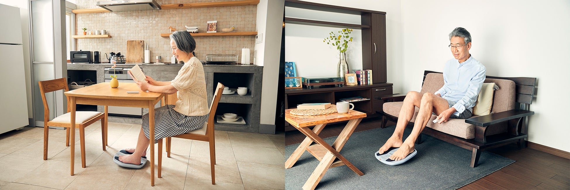 座ったまま足を乗せることで、EMS(筋電気刺激)が足裏、前すね、ふくらはぎといった歩行時に使う筋肉に効率的にアプローチします。収納のしやすさにも配慮した、薄型・軽量・コンパクトモデルです。