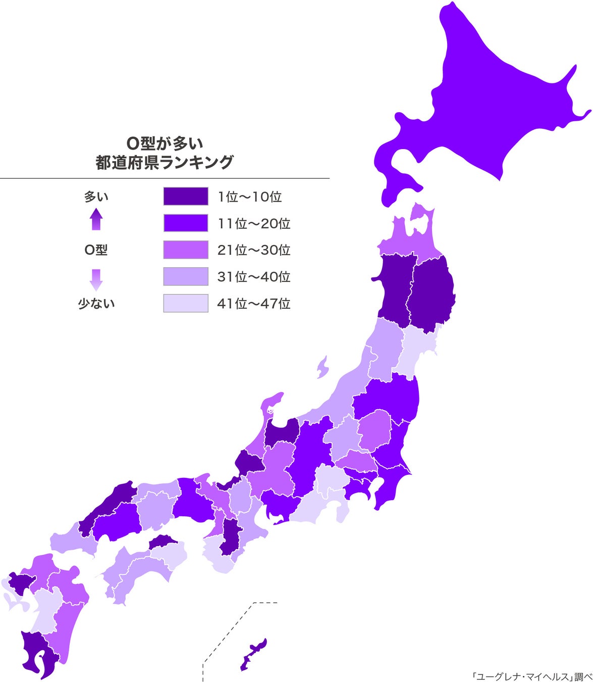 また、O型の人の割合が相対的に高い都道府県は、1位 岩手県、2位 島根県、3位 福井県、4位 佐賀県、5位 秋田県という結果になりました。A型やB型のように特定エリアに偏りはなく、全国に広がっていることが見受けられます。
