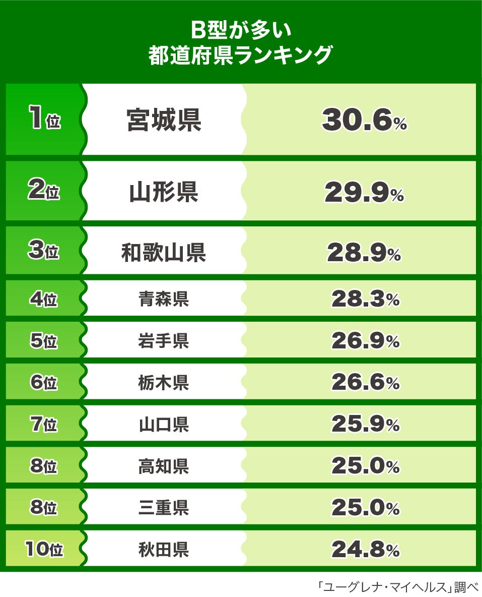 一方、B型の人の割合が相対的に高い都道府県は、1位 宮城県、2位 山形県、3位 和歌山県、4位 青森県、5位 岩手県という結果になり、東北エリアの県が上位を占めています。東日本の県が相対的に高く、A型と逆の結果となりました。