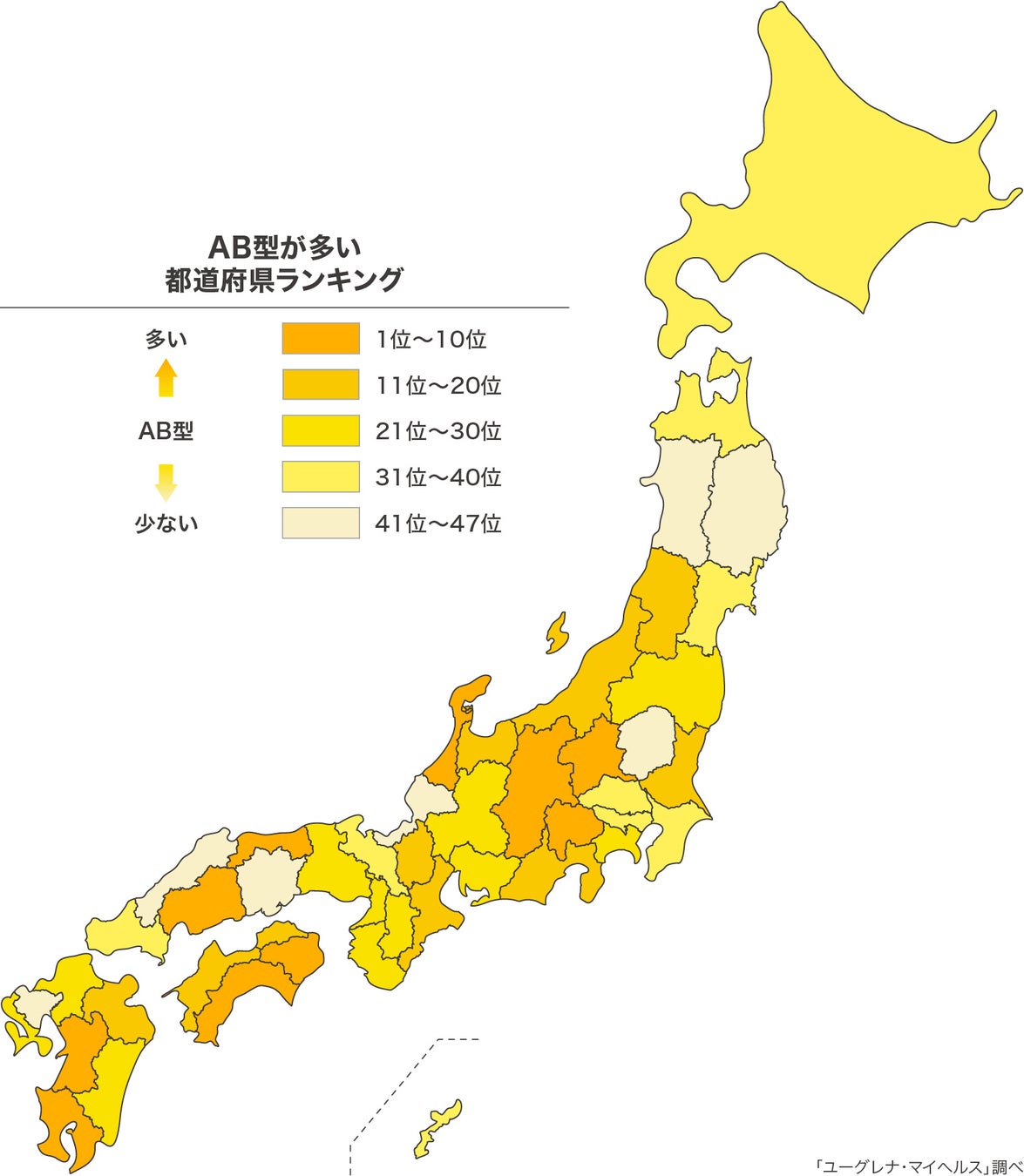 AB型の人の割合が相対的に高い都道府県は、1位 高知県、2位 石川県、3位 鹿児島県、4位 群馬県、5位 鳥取県という結果になりました。AB型もO型と同様に特定のエリアに偏りは見られませんでした。