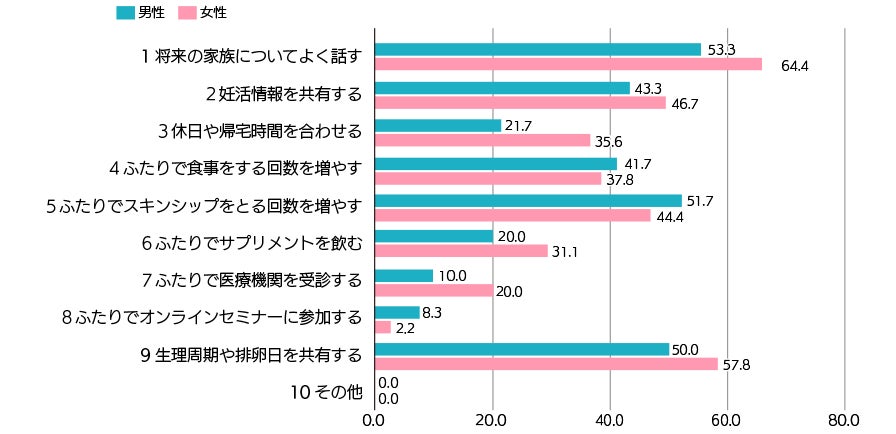 排卵日の共有以外でパートナーの方との妊活の意識共有の方法について聞いたところ、男女ともに「将来の家族について話す」が1位でした。一方で、「休日や帰宅時間を合わせる」「ふたりでサプリメントを飲む」「ふたりで医療機関を受ける」といったより積極的な妊活において、いずれも男性に比べて女性の割合が高い結果でした。
