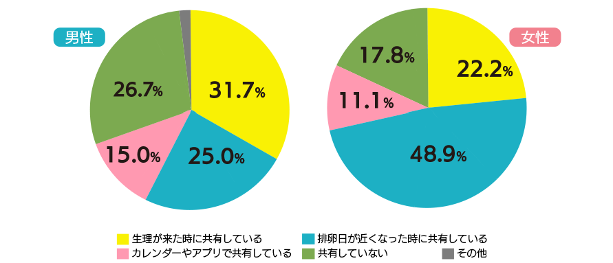 実際に排卵日を共有している人は全体で8割近くに及びました。共有するタイミングでは、女性は「排卵日が近くなった時に共有している(48.9%)」が約半数を占めていましたが、男性は「生理が来た時に共有している(31.7%)」が「排卵日が近くなった時に共有している(25.0%)」を上回り、男女のタイミングに微妙な意識のずれがあることがわかりました。
