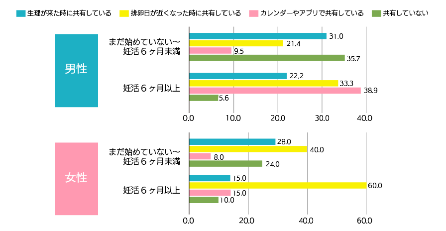 ちなみに、「カレンダーやアプリで共有」する人の割合は”6カ月以上の妊活を行っている男性”に最も多く、同じく6カ月以上の妊活を行っている女性に比べて2.5倍に及びました。
