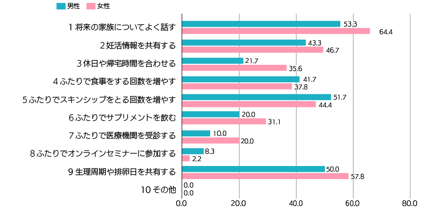 排卵日の共有以外でパートナーの方との妊活の意識共有の方法について聞いたところ、男女ともに「将来の家族について話す」が1位でした。一方で、「休日や帰宅時間を合わせる」「ふたりでサプリメントを飲む」「ふたりで医療機関を受ける」といったより積極的な妊活において、いずれも男性に比べて女性の割合が高い結果でした。