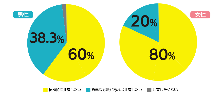 排卵日の共有について意識では、「積極的に共有したい」が女性は80%、男性は60%と共に大半を占めました。しかし、次に多かった「簡単な方法があれば共有したい」では、女性は20%に対して男性は38.3%と2倍近い結果となりました。