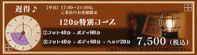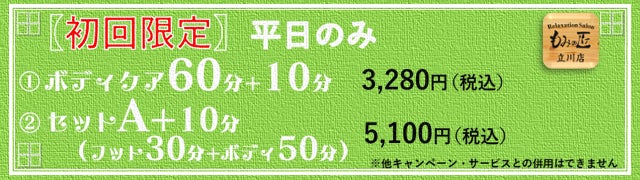 もみの匠 立川店では、平日お得なキャンペーンとして平日限定の特別コースを作成し多数ご用意しております。