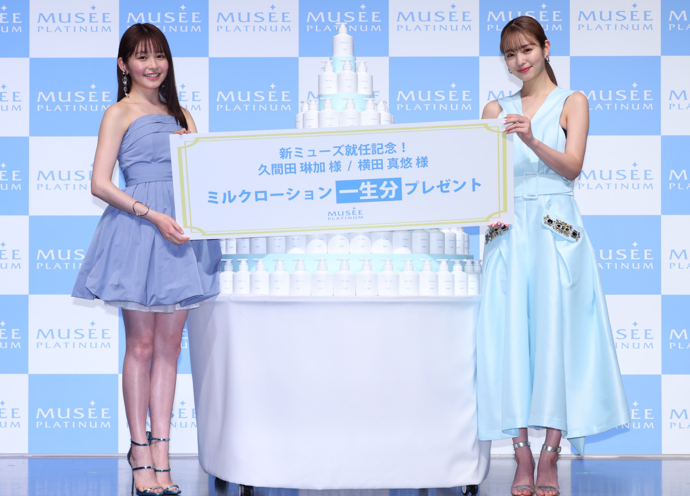 多くの報道陣が集まる中、イベント後半では、新ミューズに就任されたお二人にミュゼプラチナムの大人気アイテム「ミルクローション」を”一生分“プレゼント。このミルクローションタワーを見て横田さんは「え!一生分!?お家が大変なことになりそう!」と驚いた様子で、久間田さんは「これで一生ボディローションには困りませんので、助かりました!」とコメントし、喜びを表現されていました。