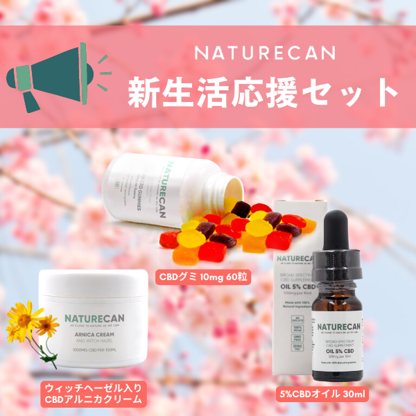 英国発のCBD専門店Naturecan(ネイチャーカン)では、新生活を迎える皆さまにぴったりなこの春だけの数量限定セットをご用意致しました。人気のCBDオイルに、初心者でもトライしやすいCBDグミ、こわばる首や肩のケアにも使えるCBDアルニカクリームが入った今だけ超特価セットです。