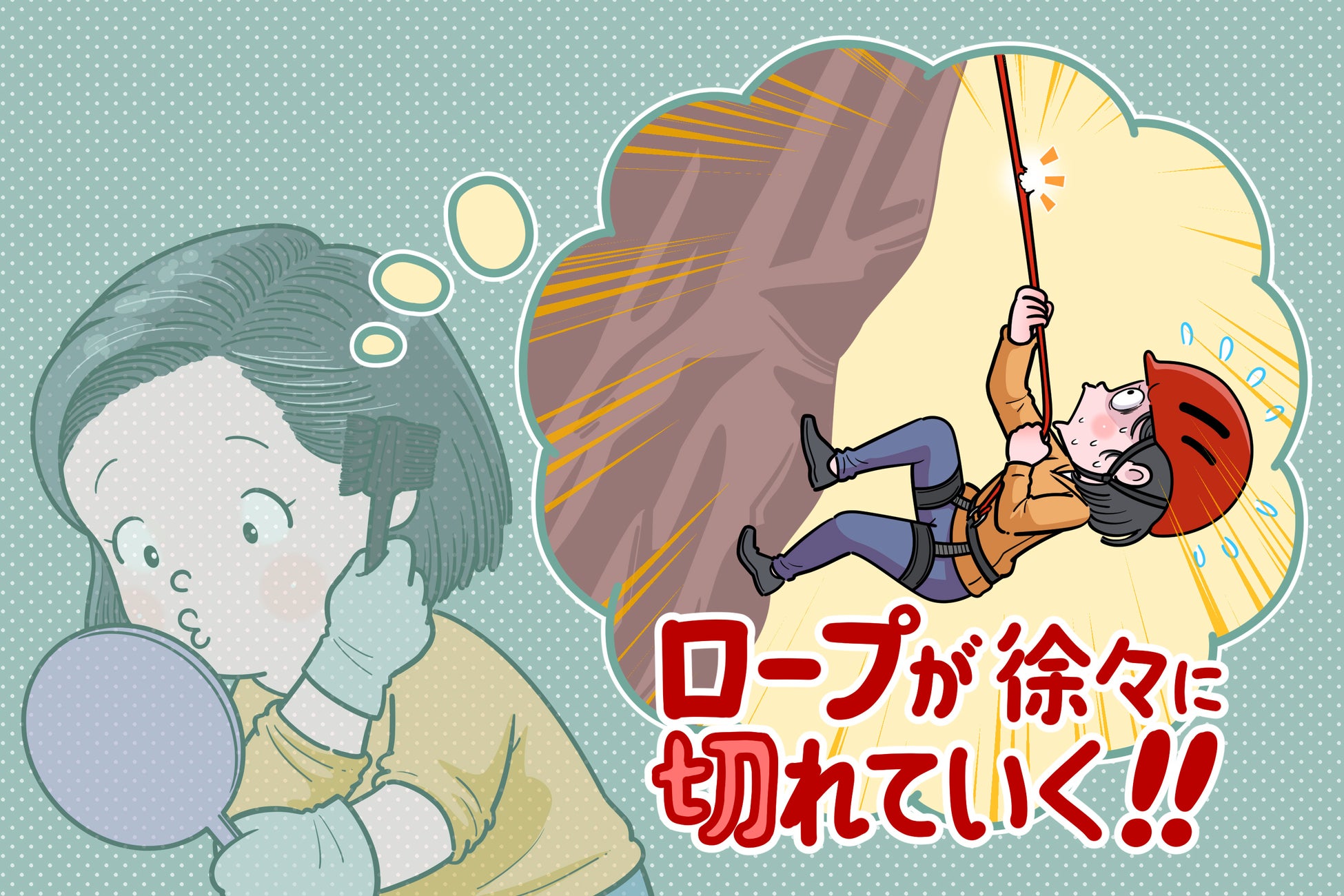 ② カラーリングやパーマ、白髪染めを1年で2回した場合、ダメージを受けた毛髪の切れやすさ≒ロッククライミングのロープ繊維のうち30%が切れ、切れやすくなったロープ