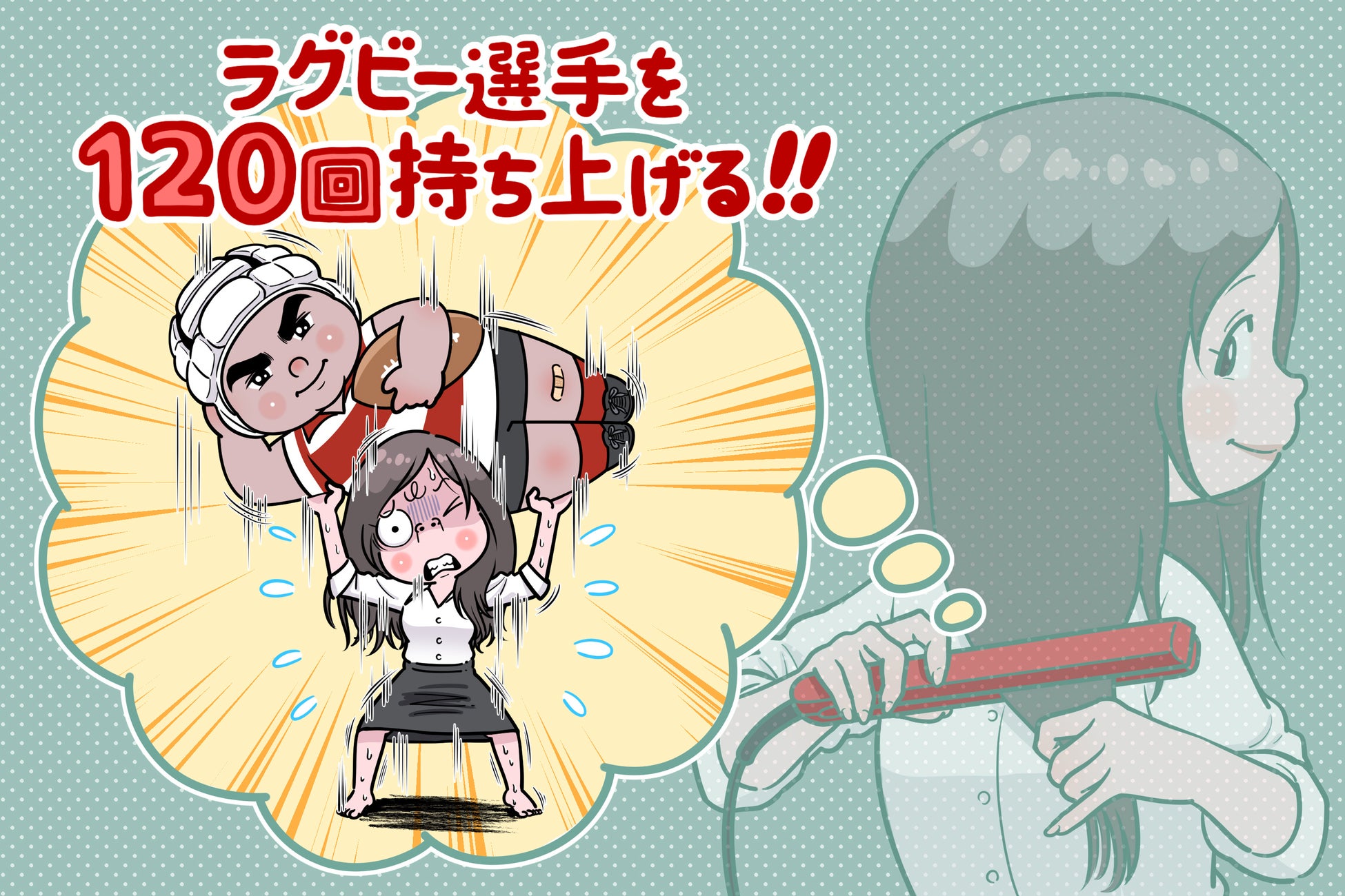 ① 「ヘアアイロンを使ってスタイリングした髪の負担(仕事量)×365 日」≒100kg のラグビー選手を120回持ち上げる負担(仕事量)