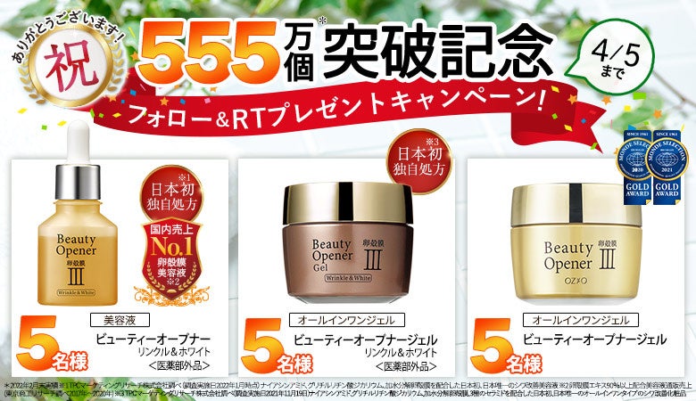 累計販売数555万個突破を記念して、 「ビューティーオープナー リンクル&ホワイト<医薬部外品>」 「ビューティーオープナージェル リンクル&ホワイト<医薬部外品> 」 「ビューティーオープナージェル 」を抽選で各商品5名様、計15名様にプレゼントいたします。