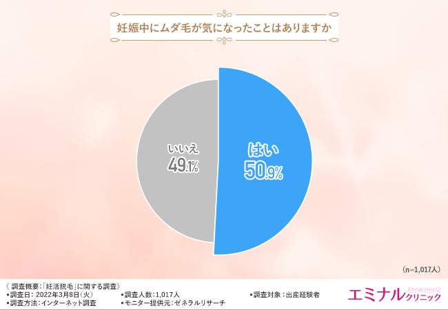 「妊娠中にムダ毛が気になったことはありますか」と質問したところ、半数以上の方が『はい(50.9%)』と回答しました。