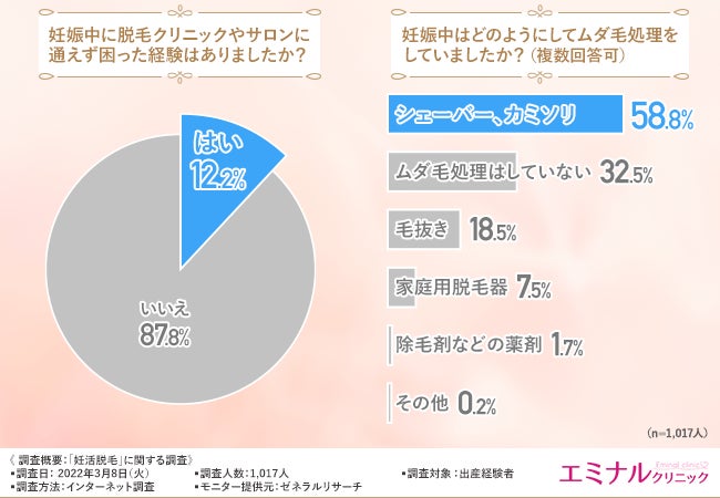 そこで今回、医療脱毛のエミナルクリニック(https://eminal-clinic.jp/lp01/?refmedia=11073)は、出産経験者を対象に、「妊活脱毛」に関する調査を実施しました。