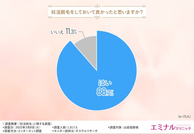 そこで、「妊活脱毛をしておいて良かったと思いますか?」と質問したところ、9割近い方が『はい(88.7%)』と回答しました。