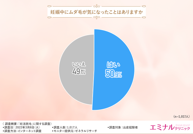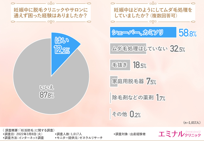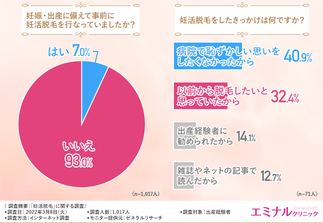 そこで今回、医療脱毛のエミナルクリニック(https://eminal-clinic.jp/lp01/?refmedia=11073)は、出産経験者を対象に、「妊活脱毛」に関する調査を実施しました。