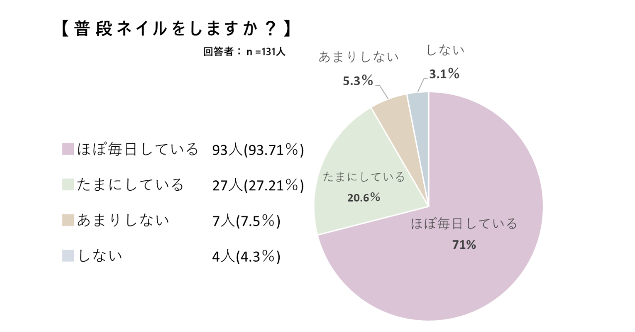 この度、株式会社JUMII TOKYO(所在地:東京都渋谷区 代表取締役:前島ゆみ)は、3月23日-27日までの期間に美容に関心のある10代から50代の女性131人へ「ネイルの不満に関するアンケート調査」を実施しました。