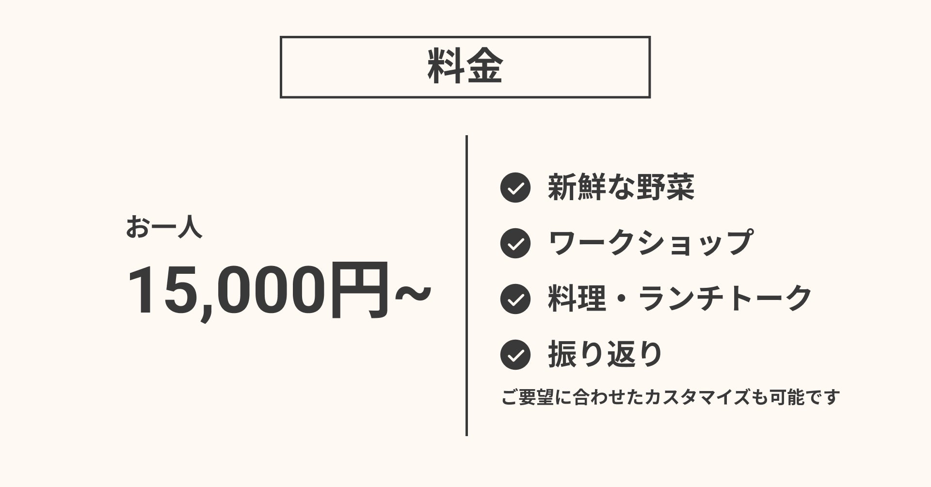 WeFarmVegeは法人向けに15,000円/人〜から提供されます最低催行人数は10名〜となっています。料理に必要な調理器具をセットにしたオプションキットも用意しているため、はじめて料理をされる方でも安心してご参加いただけます。