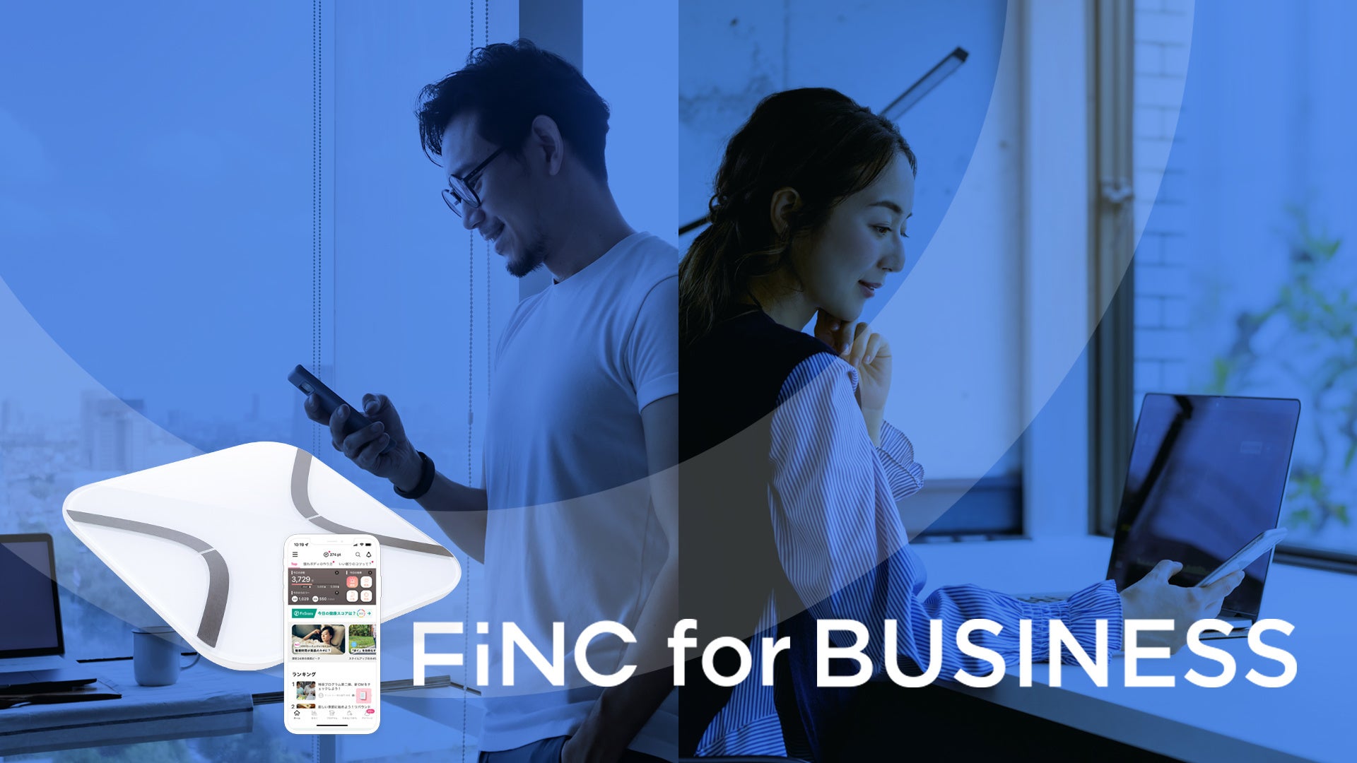 ※2「FiNC for Business」は、ライフログや健康改善を促すプログラムをは維新する従業員向けの専用アプリと、アプリと連携し手軽に体重記録ができる体組成計※3、それらを企業側が管理するためのシステムなどを含めたサービスです