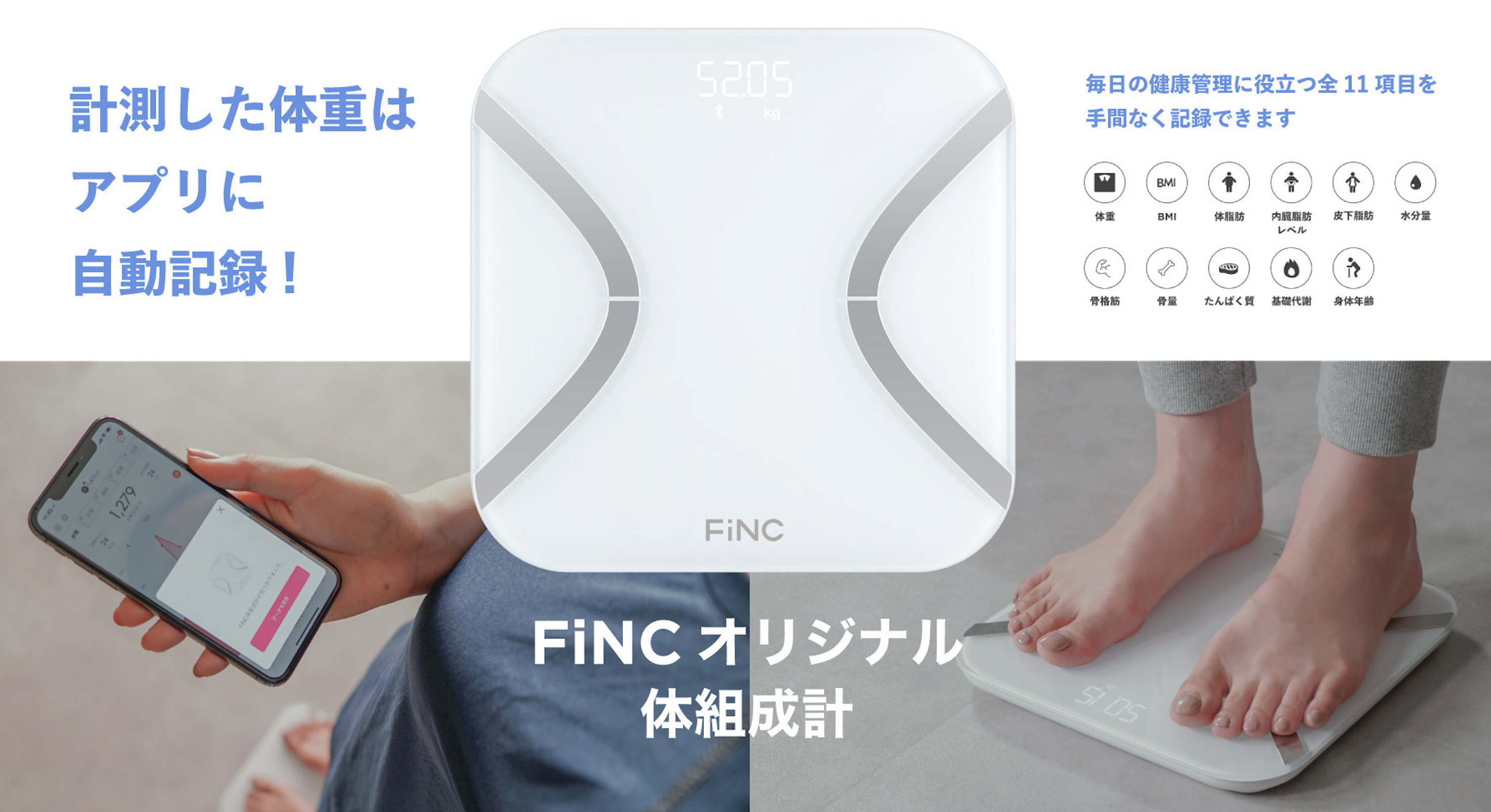 ※3 FiNCアプリと連携できる体組成計。「体重」「BMI」「体脂肪」などの全11項目を記録可能。