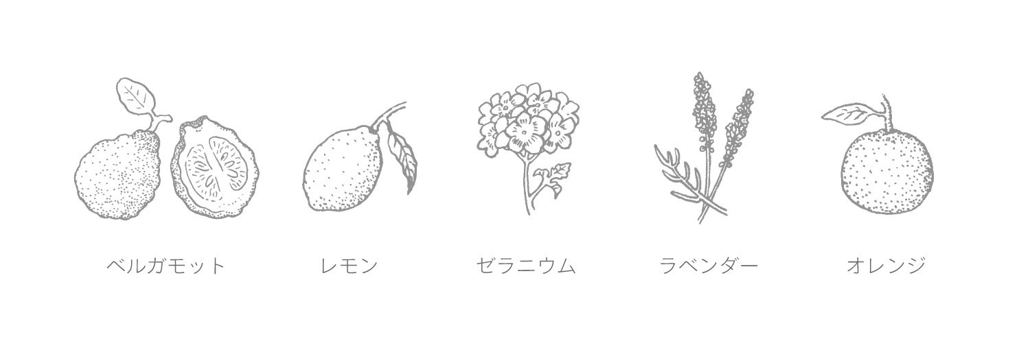 ベルガモット、レモン果皮、ゼラニウム、ラベンダー、オレンジの5種の精油にアブソリュートを組み合わせた、天然由来100%ながらフレグランスのように奥⾏きのあるフェミニンな⾹り。