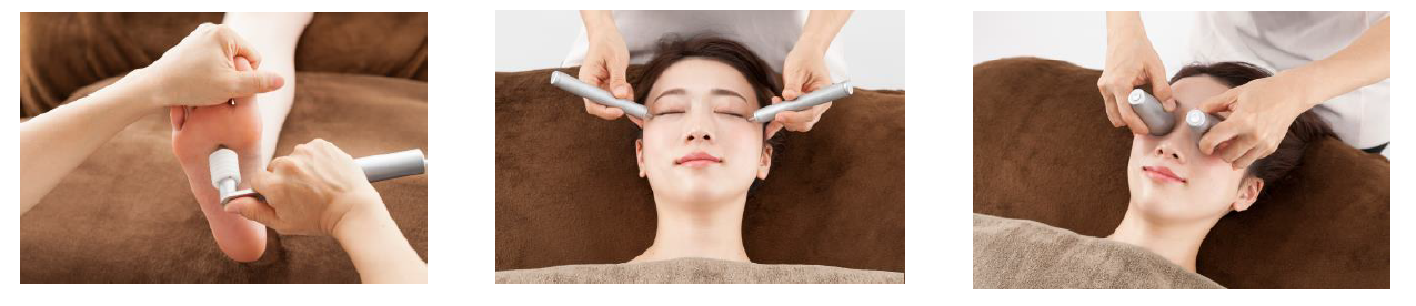 中医学に基き、眼と眼の周りを顔のツボは勿論、足や手・首・頭などのツボを刺激し、