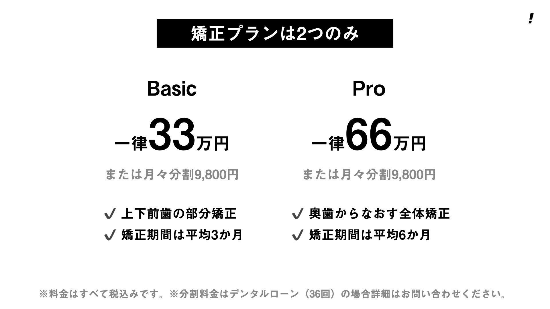 Oh my teethの矯正プランは2つのみ。上下前歯の部分矯正プラン(Basicプラン)は33万円、全体矯正(Proプラン)は66万円です。これらの料金は、期間や回数に関わらず一律。ユーザーの約9割*が、Basicプランを契約しています。