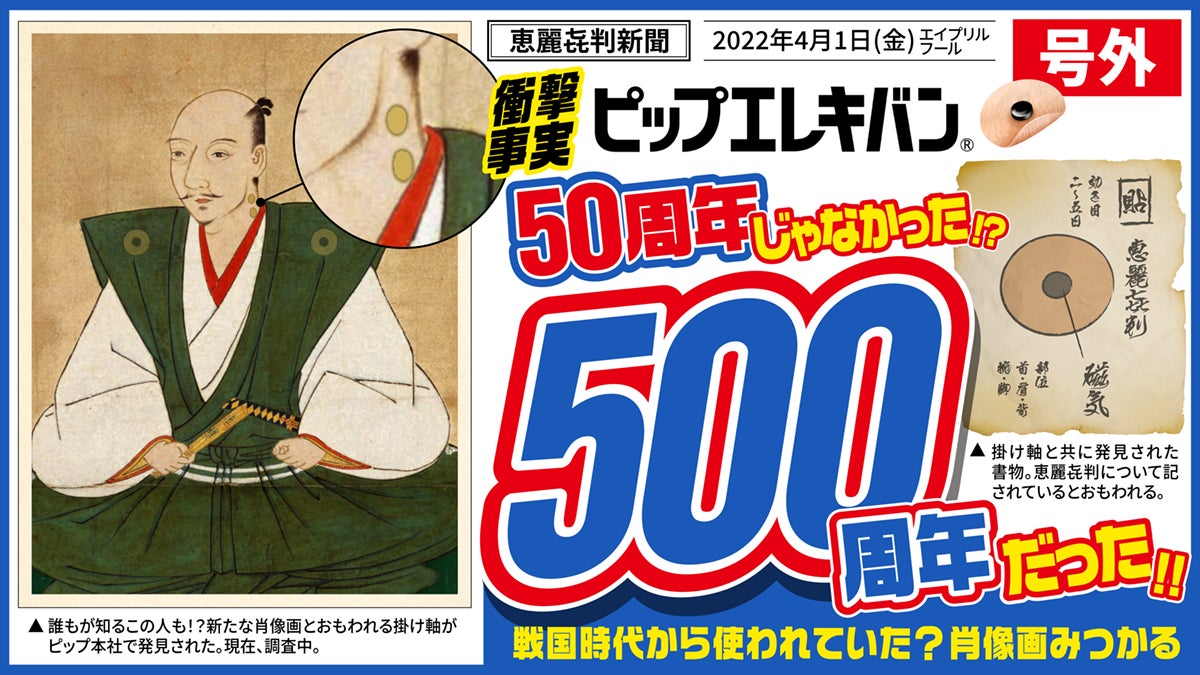 ピップ株式会社(本社:大阪市中央区、代表取締役社長:松浦由治)が製造販売し、今年誕生50周年を迎えると思われていた「ピップエレキバン」が、実は500周年だったことが判明しました。ピップ本社地下にて、発見された掛け軸には、ピップエレキバンの起源とされる「恵麗喜絆」を貼っているとみられる織田信長の姿が描かれています。戦国時代の人々もコリをケアしていたという今回の発見を受け、ピップ社内では喜びと驚きの声が広がっています。