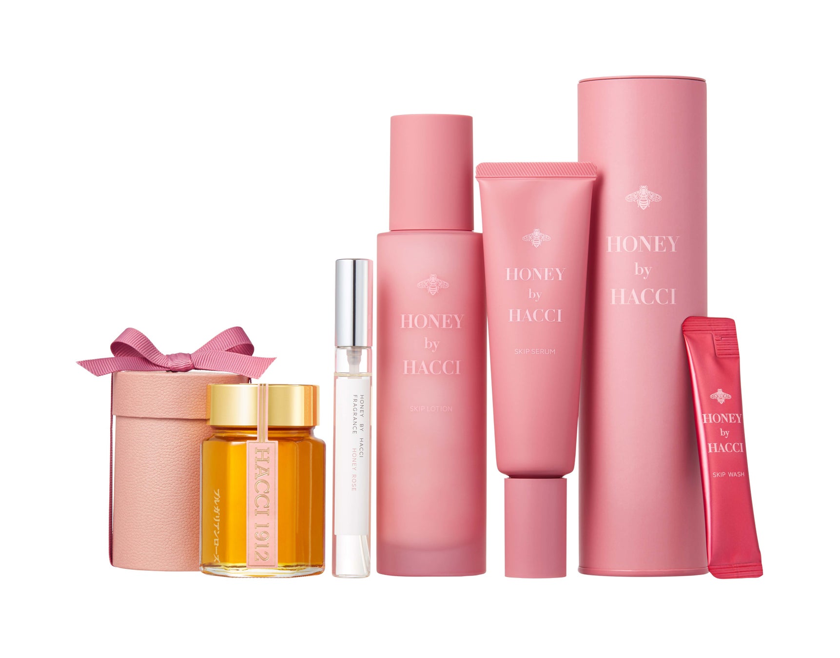 HONEY BY HACCI の世界観を家でも満喫できるスペシャルキット。2分でスキンケア完了する2 SKIP BEAUTY と新商品のスキップウォッシュに加え、HONEY BY HACCIに配合されたブルガリアンローズハニーとローズハニーの香りも一緒に楽しめます。