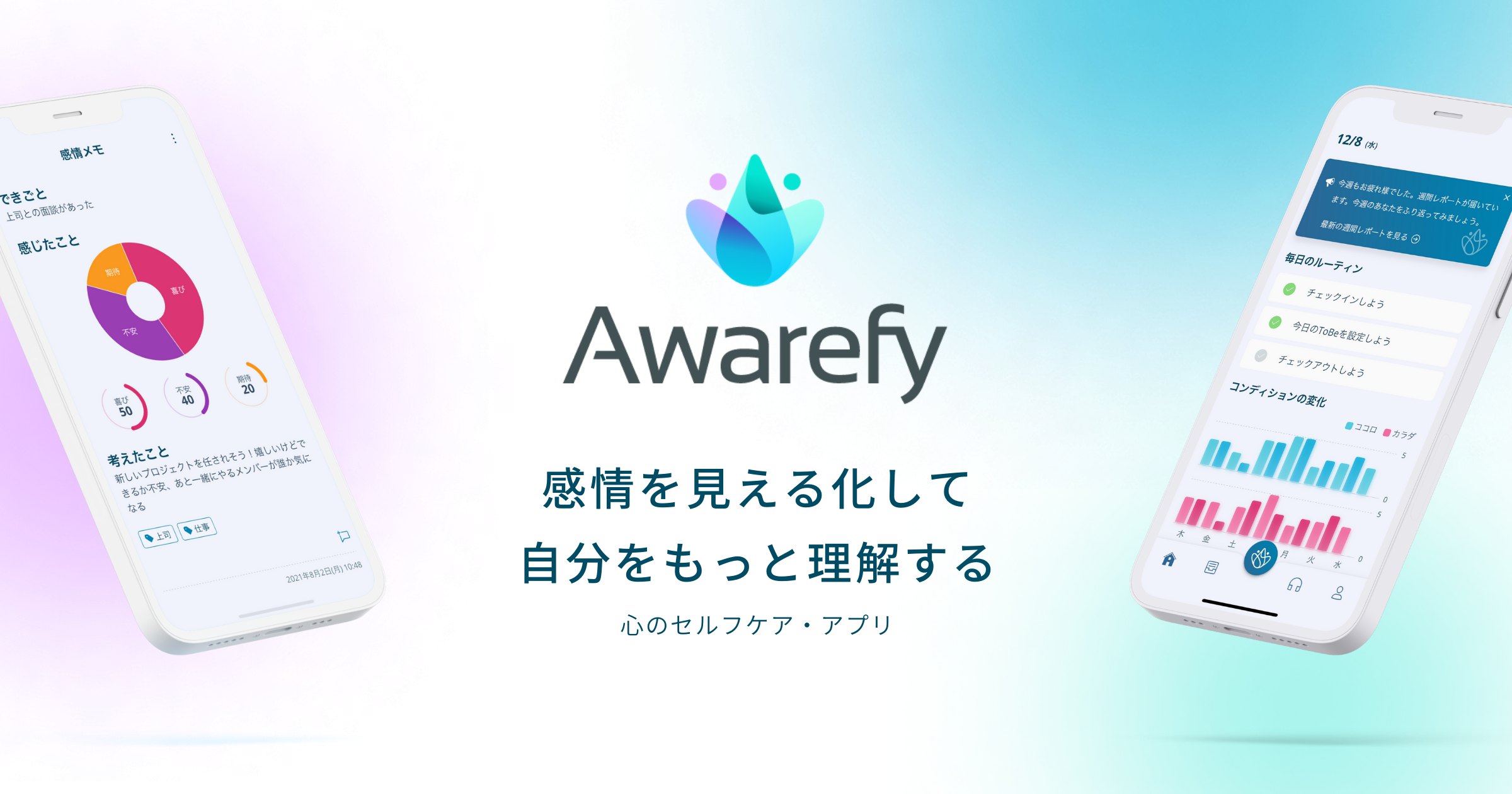 Awarefy は、スマホで手軽に日々の体調や感情を記録し振り返ることができ、アプリで「デジタル認知行動療法」に取り組むことをサポートします。