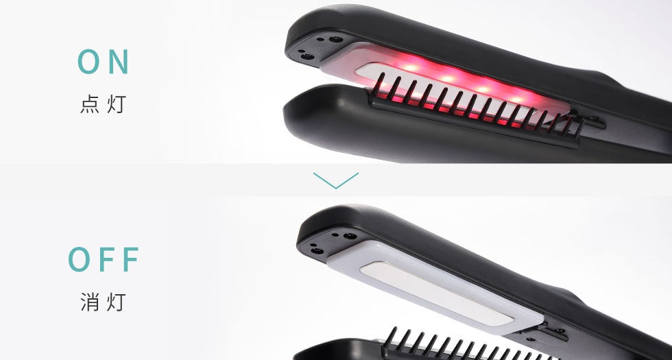 オーバートリートメント防止のために、トリートメント剤を塗布後、製品に髪を挟んだまま10秒経過すると、自動的に超音波の出力を停止、LEDプレートが消灯します。