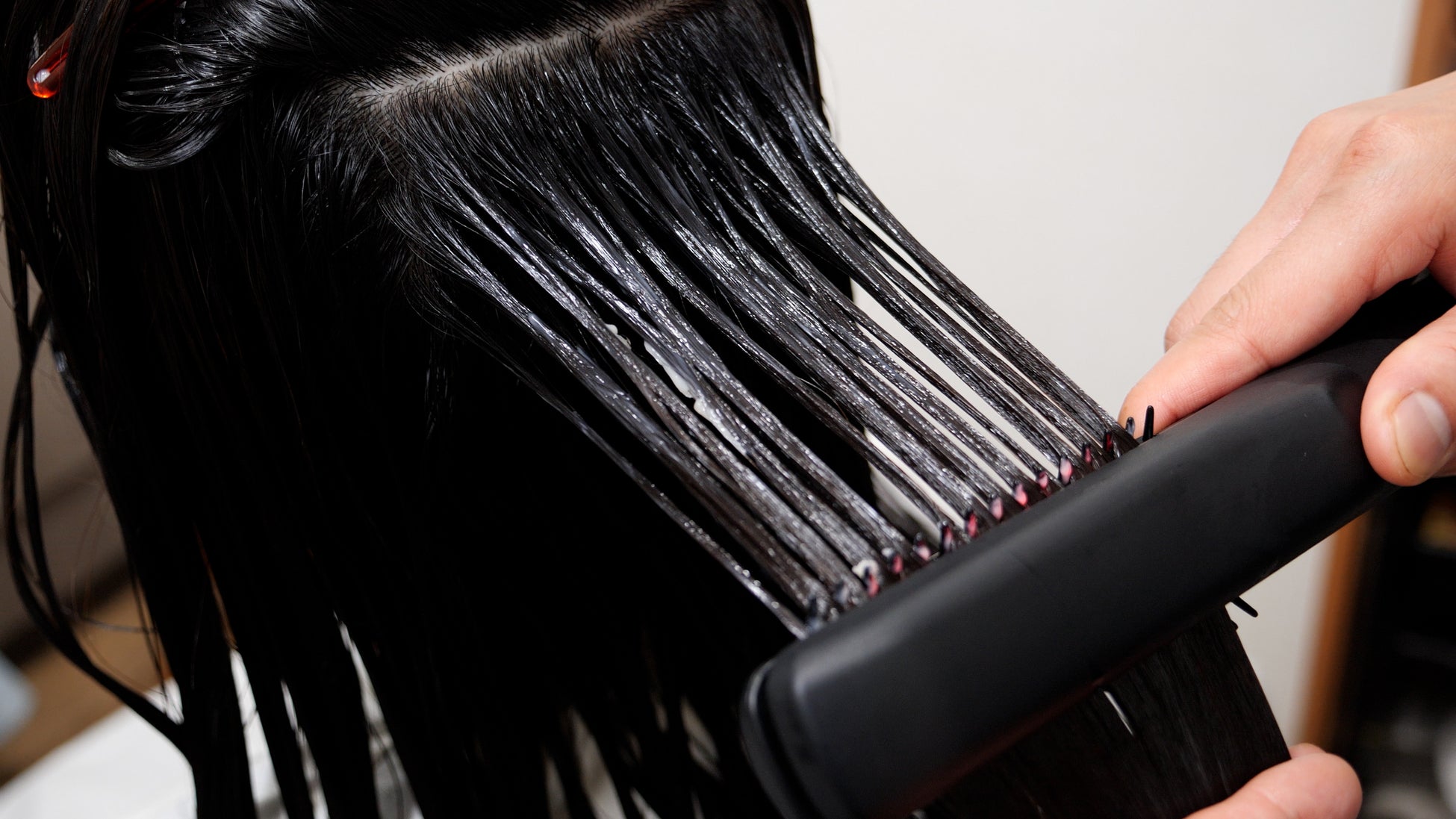 市販のトリートメント剤を塗布した後、プレートの中央で髪を挟み、毛先へ向かって、本体をまっすぐ滑らせます。