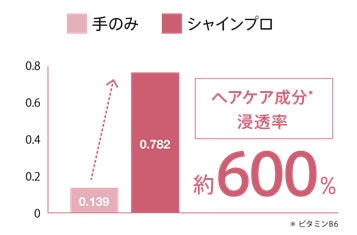 *1 ビタミンB6水溶液に浸した毛束に超音波アイロン(本製品と同等の仕様)を1分間照射したものと、同様の毛束を手で1分間なでつけたものについて、コルテックス中のビタミンB6を測定した。超音波を1分間照射したものの方がビタミンB6が約6倍多く存在した。