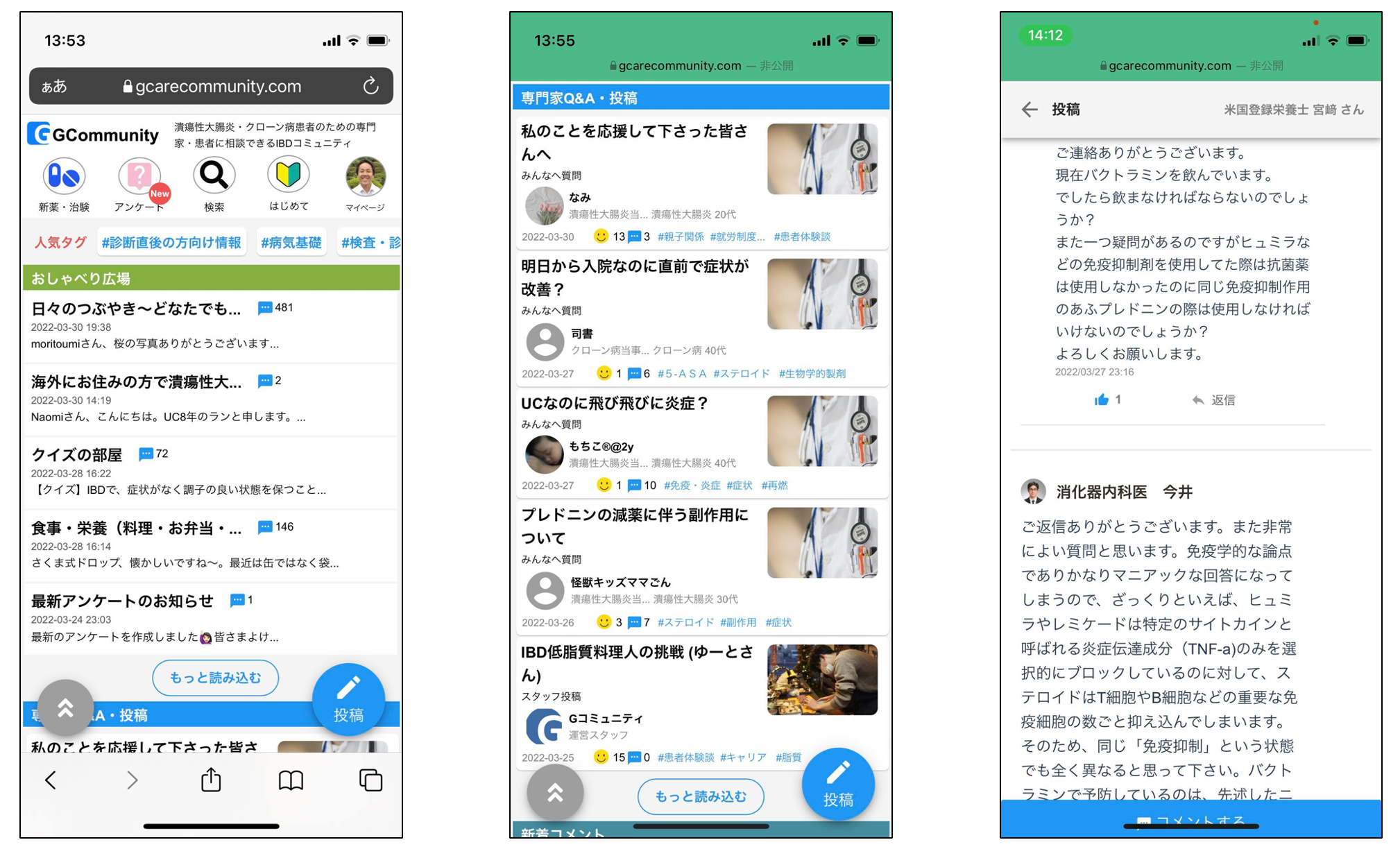 Gコミュニティは医療の専門家とIBD患者さんが作るクローズドオンラインコミュニティです。匿名無料でコミュニティに登録することができ、コミュニティ内で医療の専門家や他の患者さんらに不安や悩みを相談することができます。2022年3月末時点で登録ユーザー数は2200名を超えています。