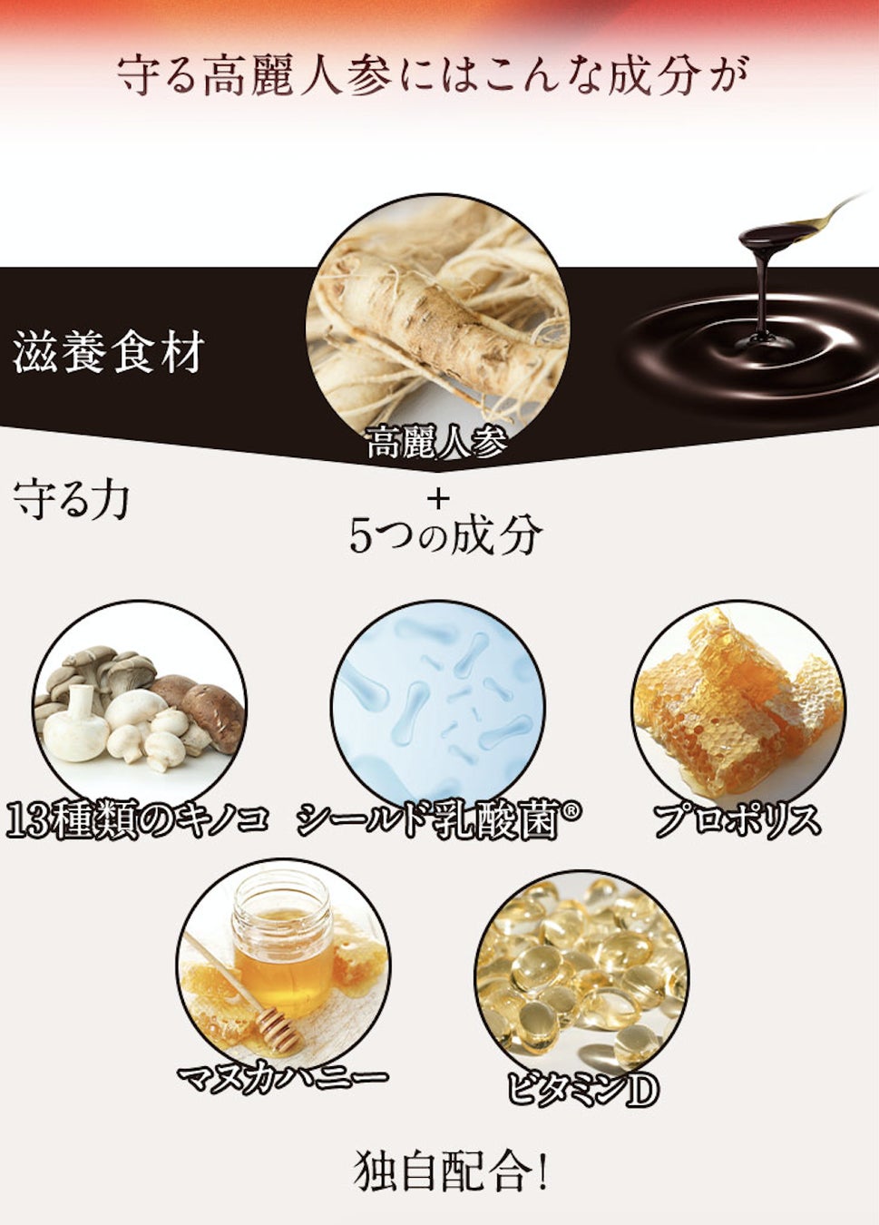 原材料名 高麗紅参エキス(韓国製造)、黒糖、イソマルトオリゴ糖シラップ、果糖ぶどう糖液糖、マルトデキストリン、精製はちみつ、還元水あめ、フラクトオリゴ糖シラップ、甘草エキス、キノコ混合粉末(霊芝、エリンギ、アガリクス、鹿角霊芝、冬虫夏草、チャーガ、マイタケ、メシマコブ、山伏茸、ハナビラタケ、タモギタケ、シイタケ、シロキクラゲ、ヒハツ)、マヌカハニー、乳酸菌乾燥粉末(殺菌)、プロポリスエキス、ラカンカエキス末/環状オリゴ糖、酸味料、甘味料(スクラロース)、ビタミンD