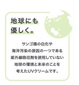 さらに、サンゴ礁の白化や海洋汚染の原因の一つである紫外線吸収剤フリーのノンケミカル処方を採用することで、環境への負担にも配慮したUVクリームです。