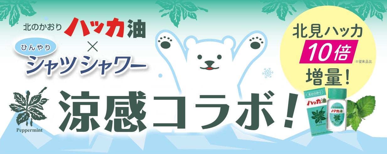 バランスの取れた涼感でみなさまに愛されている「北のかおり ハッカ油」。「ひんやりシャツシャワー 北見ハッカの香り」は、北のかおりを感じさせる清々しい香りとシャツシャワーの心地よいひんやり感をコラボレーションしたロングセラー商品です。
