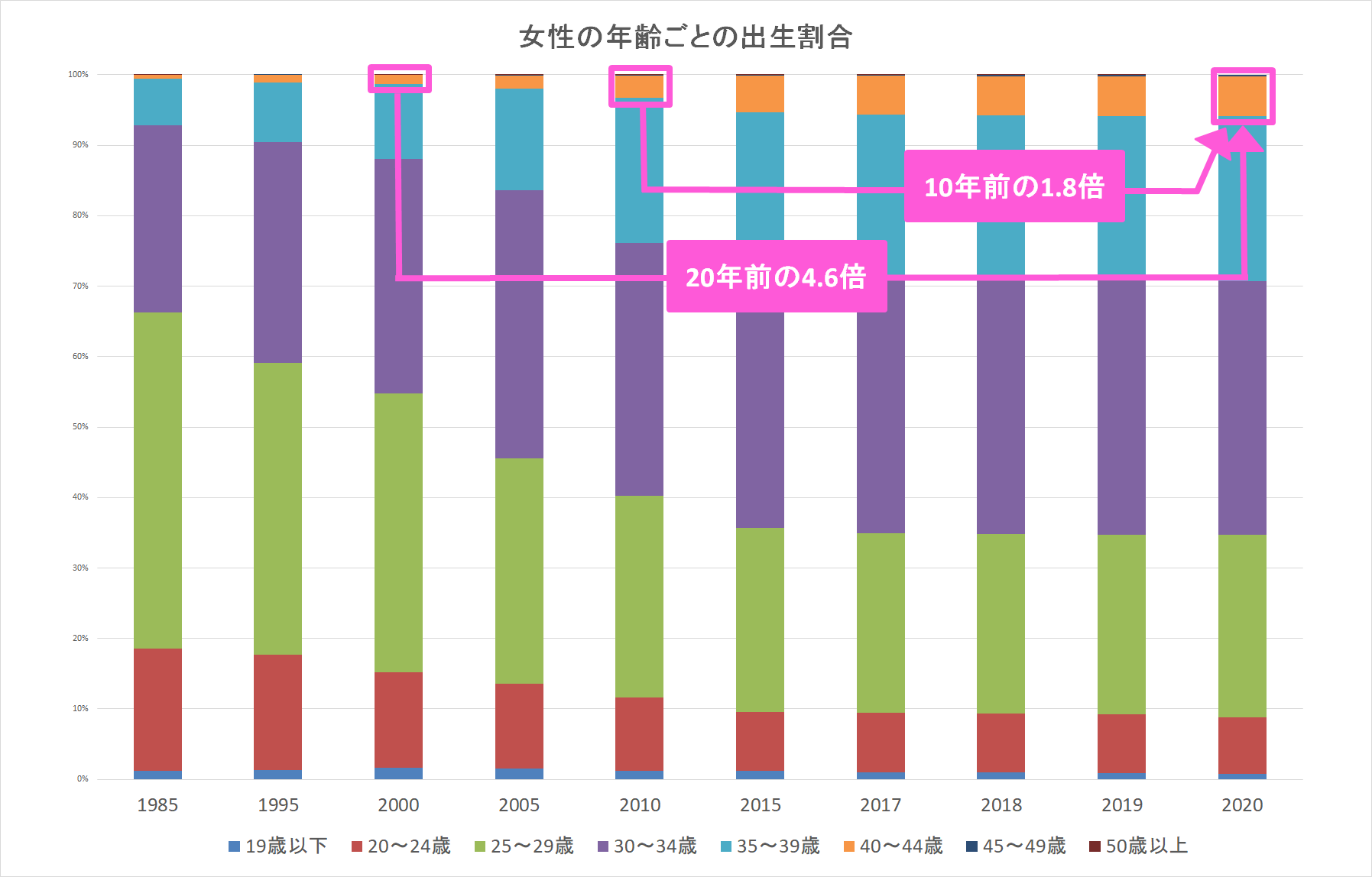 2020年の高齢出産(35歳以上の出産)割合は29.2%と全体の約3割を占め、なかでも40歳以上の出産は全体の約6%を占めました。10年前と比べると高齢出産は約1.2倍に、40歳以上は1.8倍へ。20年前と比べると高齢出産は約2.5倍、40歳以上は4.6倍となっております。(下記グラフは厚生労働省公表の資料をもとにアミーが作成)