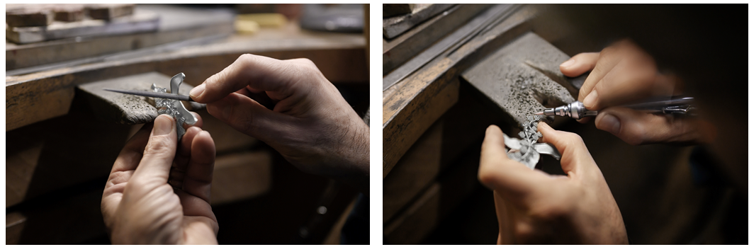 小枝と花の部分の製作に使われるのは、古代より貴金属の加工に使われてきた技術、ロストワックス鋳造。アトリエ・トゥルスチェッリで完璧にマスターされたこの製法により、細部まで緻密に鋳造することができるのです。