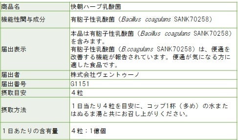 株式会社ヴェントゥーノ(福岡市中央区)が機能性表示食品制度に基づき、届出を行った機能性表示食品「快朝ハーブ乳酸菌」が消費者庁に受理されましたのでお知らせします。