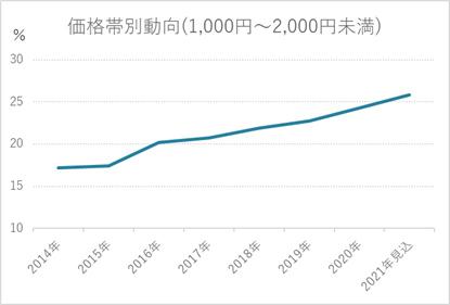 同時に1,000~2,000円台のシャンプー市場は堅調に推移しており、シャンプー市場において占める割合について、2015年時点の17.4%から、2021年(見込)は25.8%[*4]まで成長しています。2020年、2021年(見込)の市場規模を比較すると、伸長率は108%[*4]となり、堅調な推移が続いていることが伺えます。