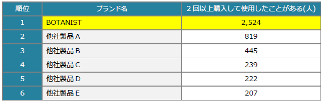 *,*2 1000円以上の高価格帯ヘアケア消費財6ブランドについてのWEBアンケートによる。男女10代~60代(n=30,000)のうち、BOTANISTを「2回以上購入して使用したことがある」と回答した方の数。2022年2月実施(自社調べ)